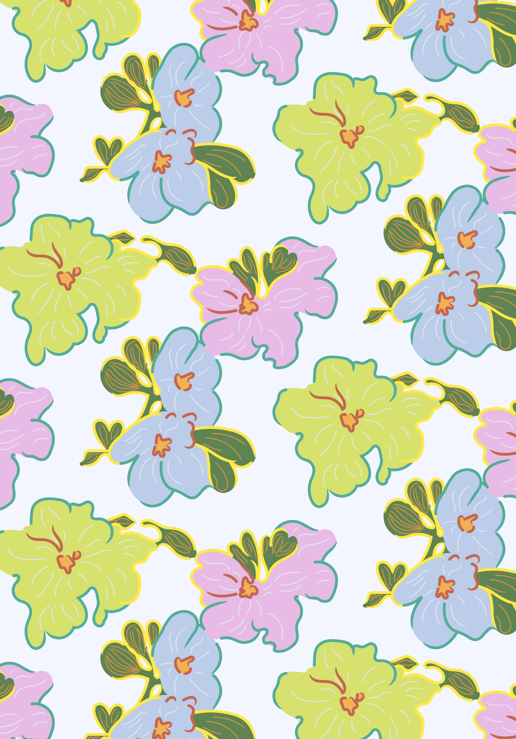 What flower is that? Ochid? Hibiscus? A floral that keeps you guessing. How far can you abstract a floral before it falls apart? If you use a classic vintage silkscreen size (29” repeat) with a very loose illustration will the print hold together? What actually creates a resonant print?