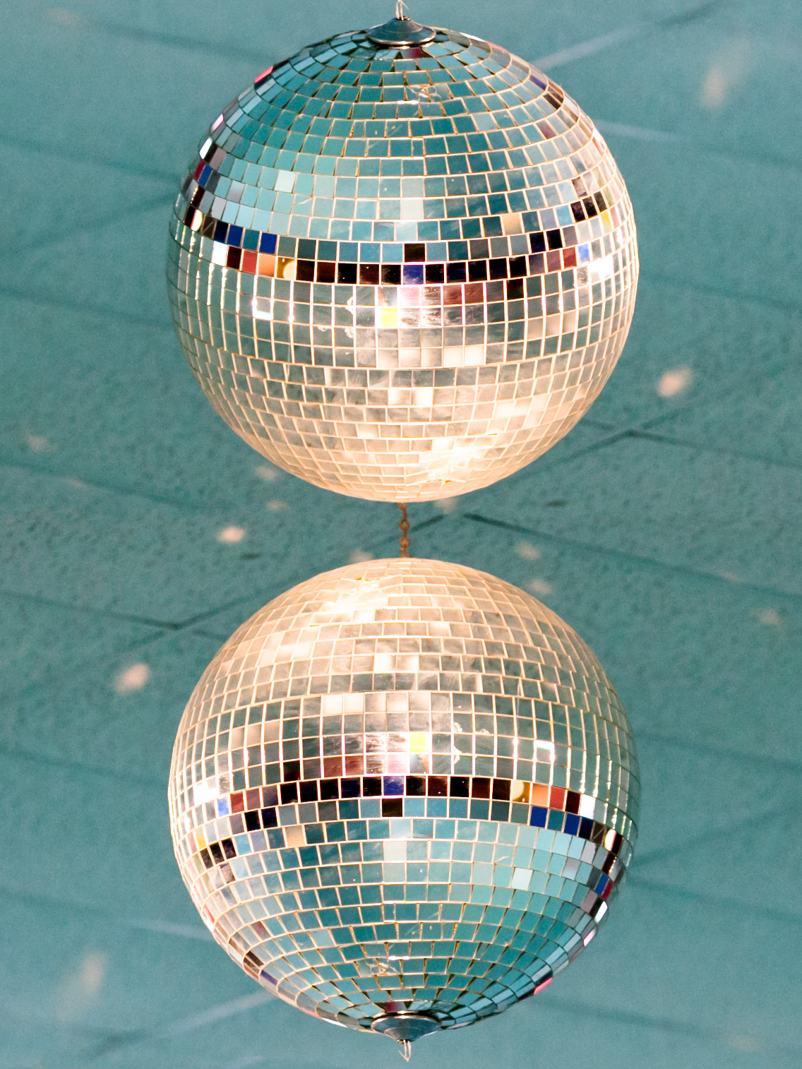 Glittering high above the dance floor is a spinning mirror covered orb throwing light in every direction. The drop ceiling should be ugly but instead it is a rippling ocean of blue. The disco ball is a little bit dinged but it is still magic. Let's put on that magic.